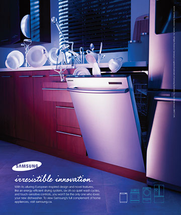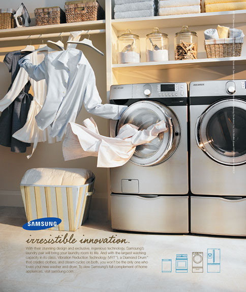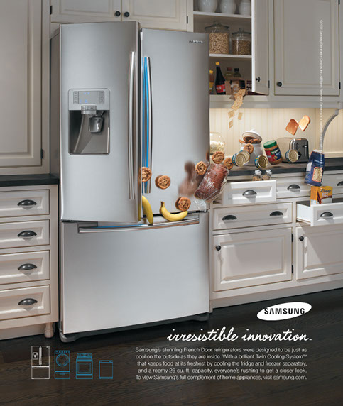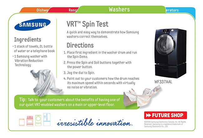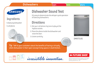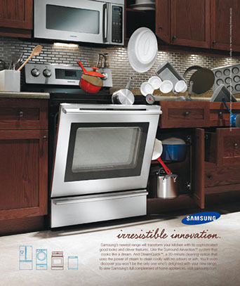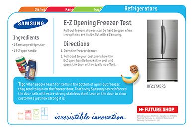 the opportunity to advertise on their big screen monitor. SAMSUNG HOME APPLIANCE DIVISION After struggling for a few years trying to break into the heavy hitting Home Appliance (HA) market in Canada, the HA division of Samsung decided to create an ad campaign that would help spread the word about their beautifully designed technology and inform Canadians that Samsung made more than just TVs. After the House & Home magazine print, retail, online and sales support campaign had ran, sales increased by 83%. As a result, the division had reached a milestone of $10 million/month sales goal. SALES MATERIAL We created double sided small post-cards that the sales team could use as 'leave-behinds' when meeting with their clients. They were really well received and helped educate staff and customers. RETAIL / POP These are examples of fridge 'clings', that were placed on the appliance at store level to share more information about the incredible technology these appliances had to offer.