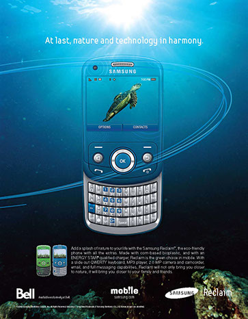 people to the website. HDTV RETAIL DISPLAYS Best Buy and Future Shop examples shown. SAMSUNG RECLAIM When Samsung created a mobile phone made completely from a biodegradable plastic, we created a B2B video for Bell, and print ads to support the message.