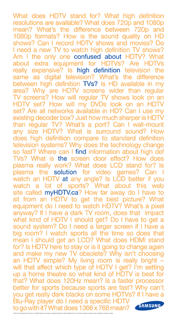 HOLIDAY GIFT GUIDE To keep Samsung top-of-mind over the holidays, we added this interactive tool for consumers on the Samsung website. HDTV NEWSPAPER AD When HDTV's hit the market, there was some confusion around the new technology. So we created myHDTV.ca as a way to educated consumers all of the considerations when purchasing a new TV. This ad got a lot of